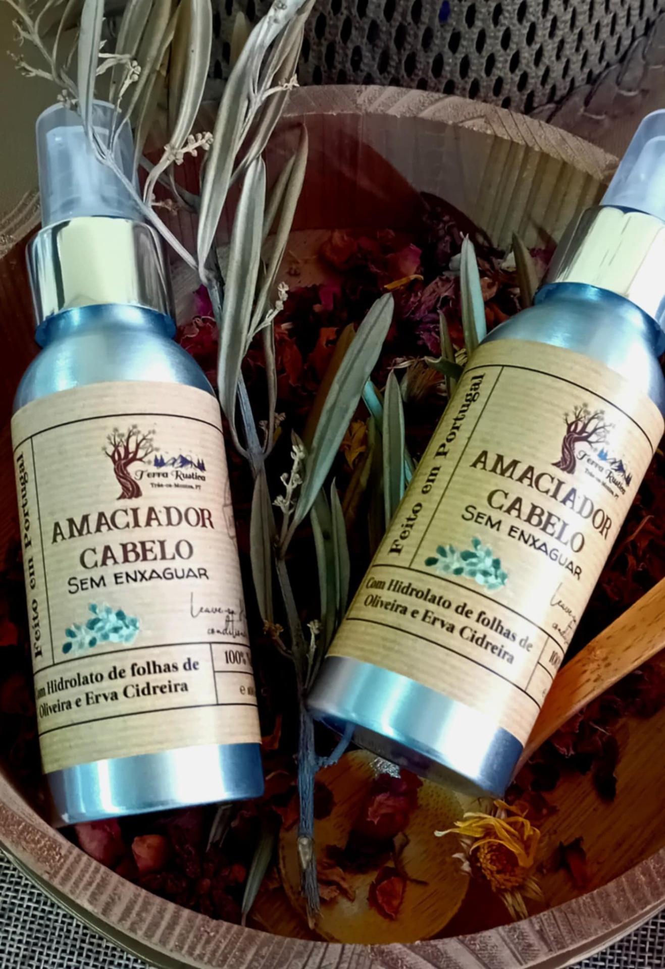 Contem ainda o hidrolato de folhas de oliveira que promove o fortalecimento do cabelo assim como a proteger a côr do cabelo.