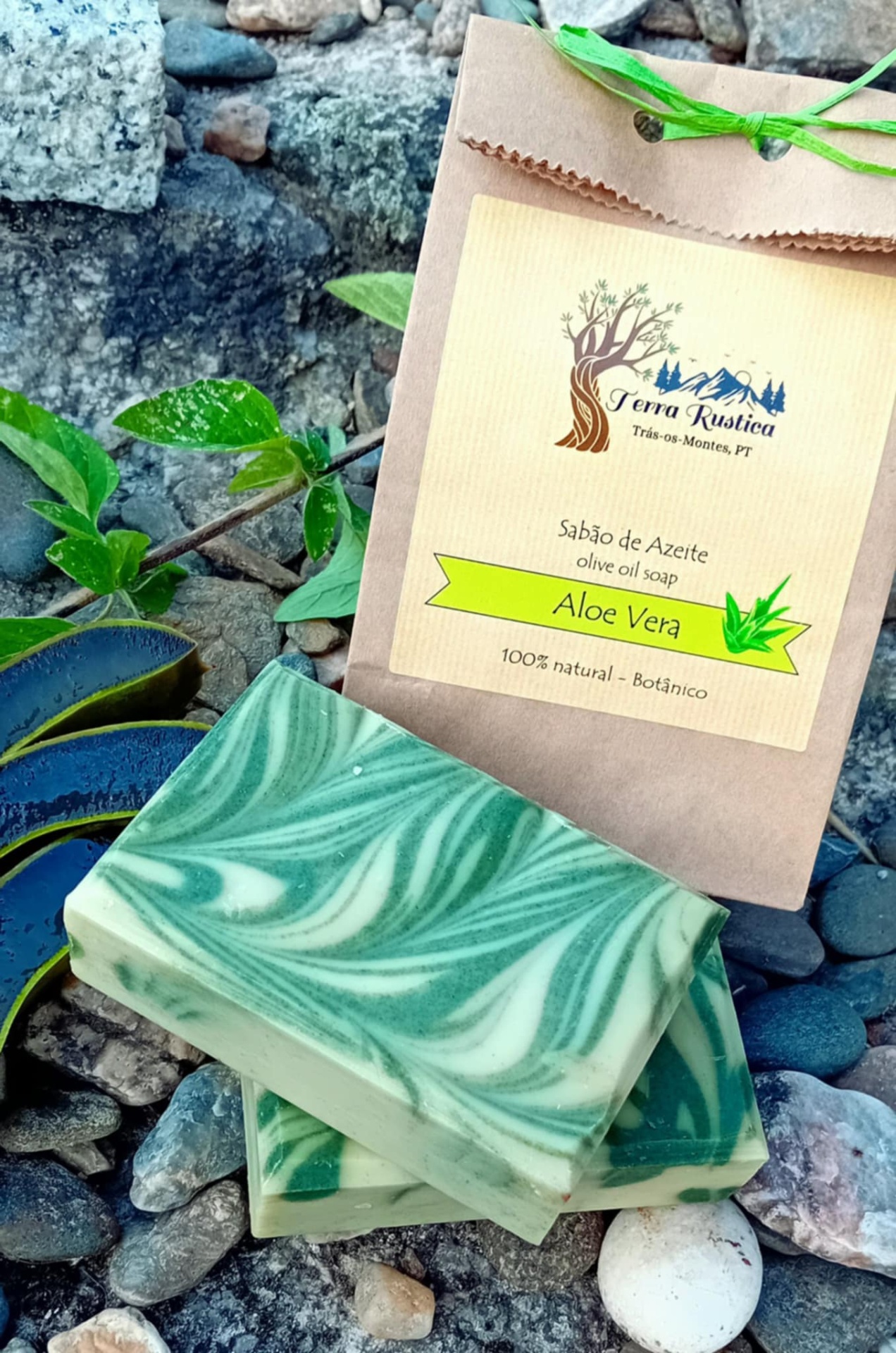 Sabão de azeite rico em gel de Aloe Vera colhido fresco da planta e usado directamente no sabão. Cada sabão contem approximadamente 13g deste gel incrível.
