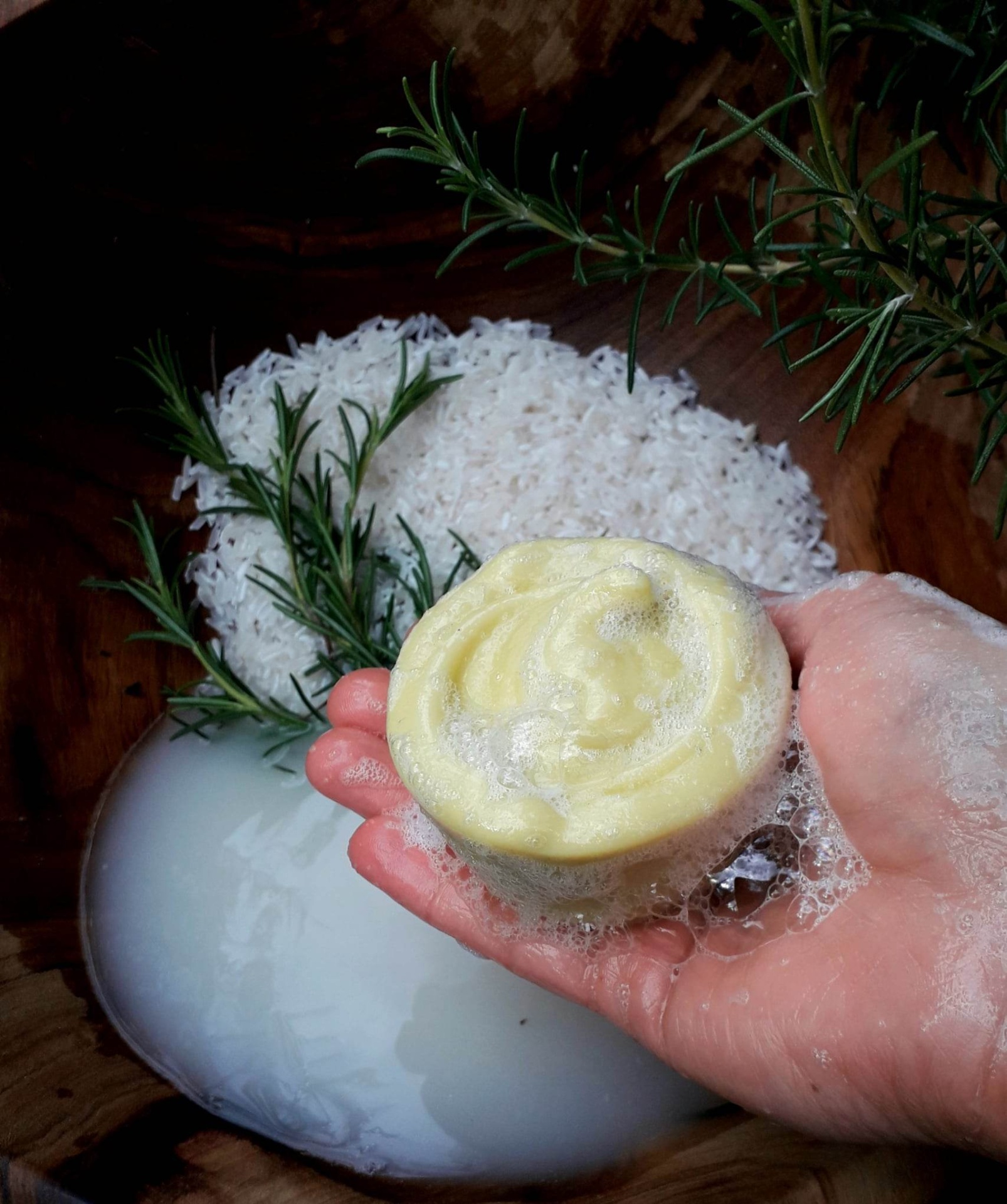 A água fermentada de arroz está carregada não só de vitaminas e minerais mas contem o mais importante ingrediente natural para o cabelo que é o Inositol.. O Inositol entra no cabelo e repára-o de dentro para fora. Não só fortalece o cabelo como tambem o protege e cria uma protecção contra fricção deixando-o forte e saudável. Esta fermentação da água de arroz é feita por nós durante 48h e imediatamente usada para fazer o sabão.